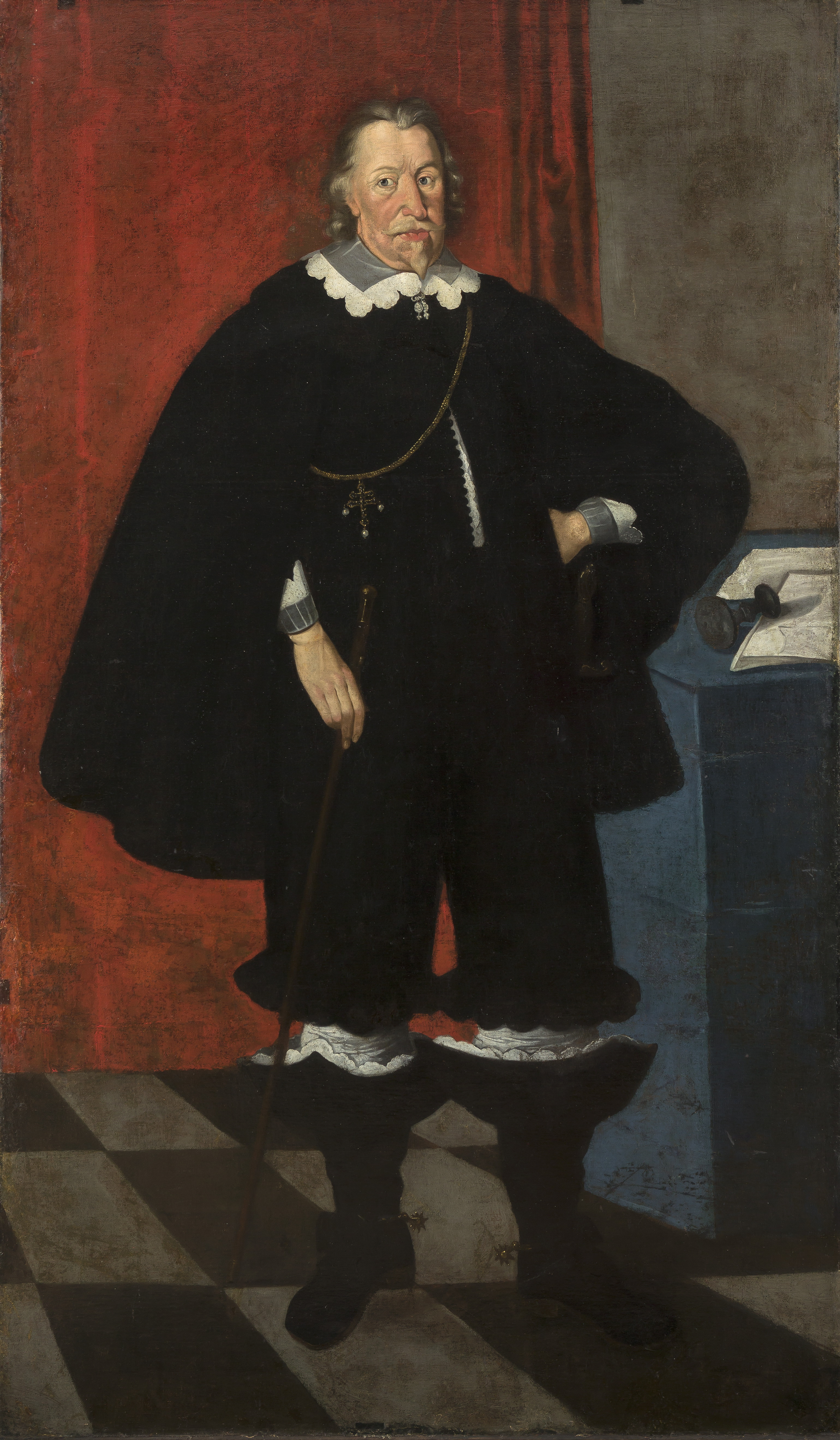 Адлюстраваны ў рост на фоне чырвонай драпіроўкі, падлога – з чорных і шэрых плітак, каля стала, пакрытага блакітнай тканінай, на якім ляжаць аркушы паперы і пячатка. Валасы сівыя, невялікія вусы і бародка. Апрануты ў чорную куртку з блакітным каўняром, абшытым карункамі, нагавіцы з фальбонамі. Высокія чорныя боты, шырокія ўверсе, маюць шпоры. У правай руцэ – жэзл з металічным дзяржаннем, пры левым баку – шпага