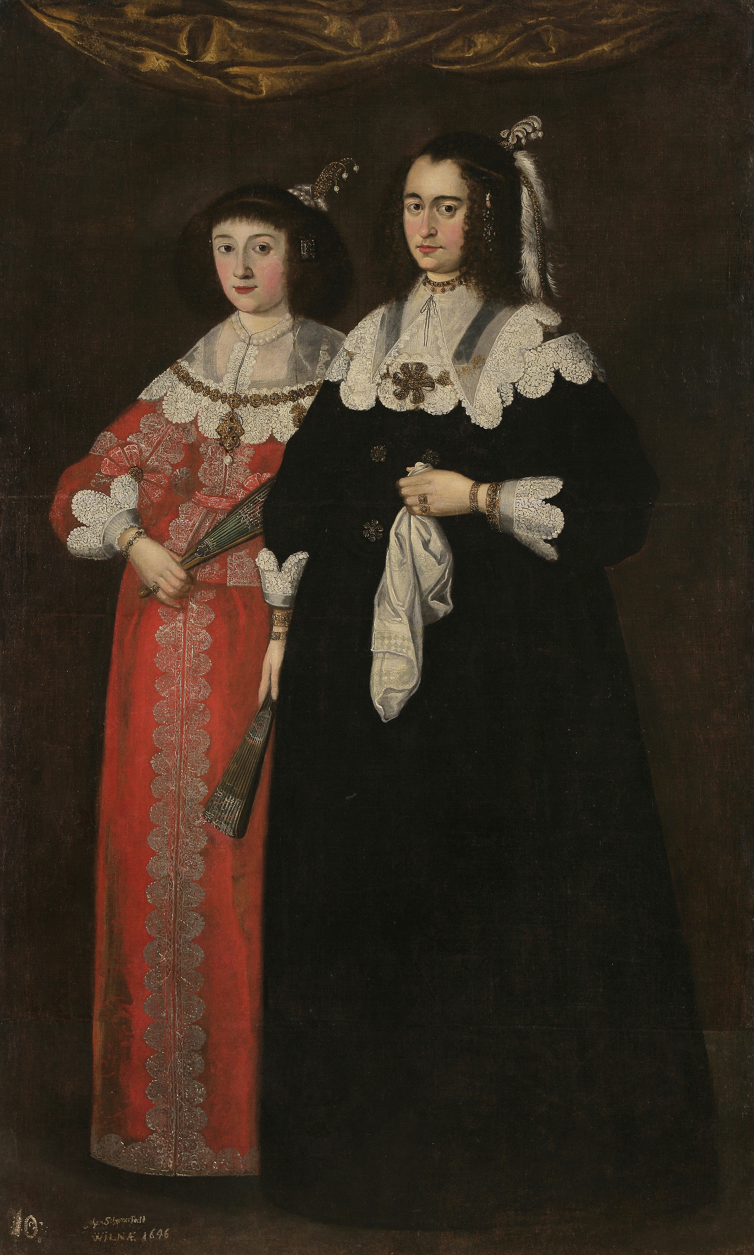 Адлюстраваны ў рост на цёмным фоне дзве жаночыя постаці: на першым плане – дама ў чорнай сукенцы з белым карункавым каўняром і манжэтамі, у правай апушчанай руцэ трымае закрыты веер, у сагнутай левай – белую хустку. У прычосцы – эгрэта з перлінамі і пер’ямі. На другім плане злева – дама ў чырвонай сукенцы з белым карункавым каўняром і манжэтамі трымае веер. У валасах – эгрэта з каштоўных камянёў. Уверсе – залацістая драпіроўка