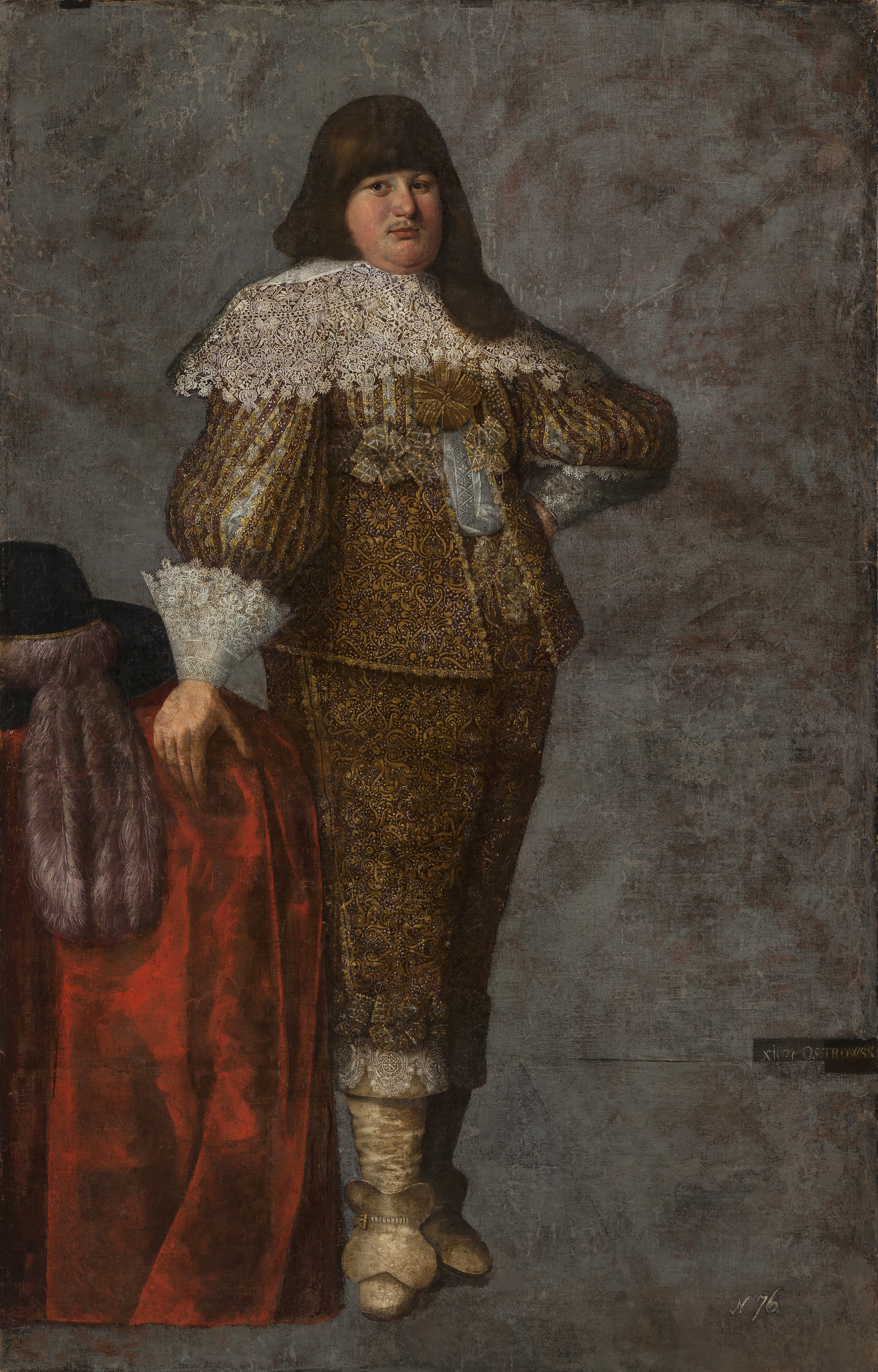 Адлюстраваны ў рост на шэрым фоне, каля стала, пакрытага чырвонай тканінай, чорны капялюш з доўгімі пер’ямі. У магната доўгія цёмныя валасы, невялікія вусы. Апрануты ў куртку і нагавіцы, расшытыя залатым раслінным узорам, з шырокім белым карункавым каўнерам і манжэтамі. Боты высокія, светлыя. Унізе справа – надпіс
