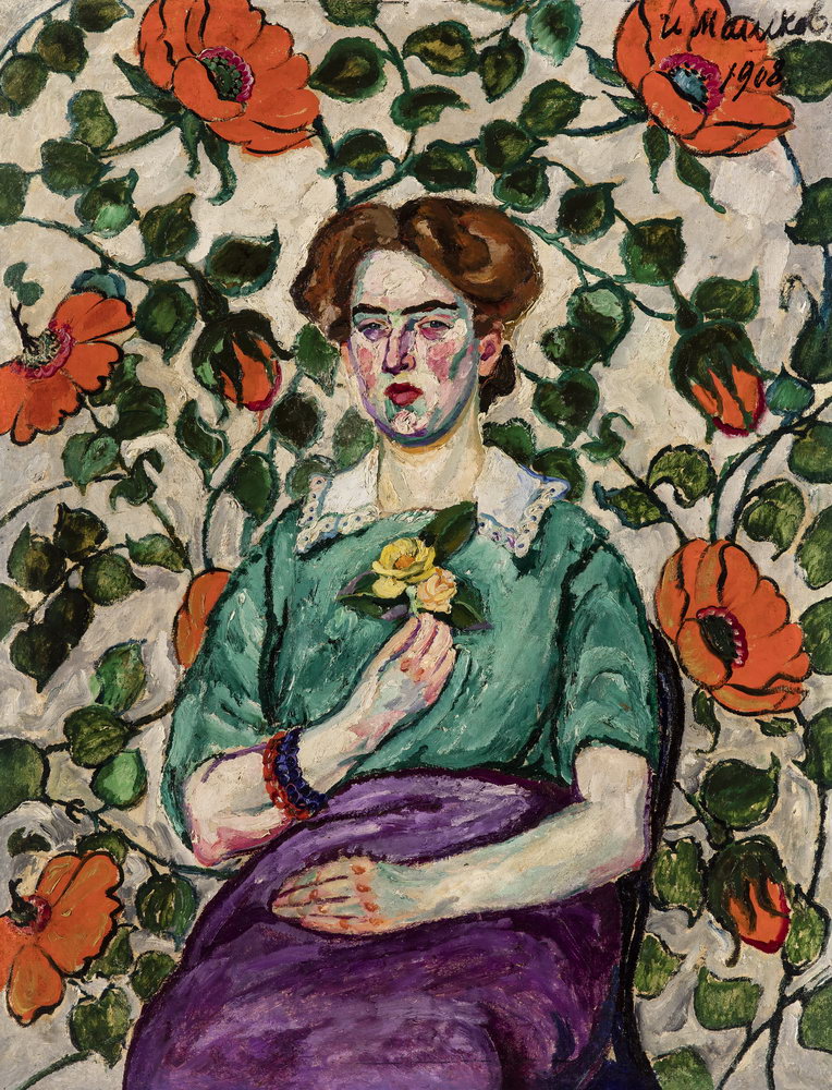 Пакаленная выява жанчыны, якая сядзіць на фоне расліннага арнаменту ў зялёнай кофтачцы і фіялетавай спадніцы з жоўтай кветкай у паднятай правай руцэ.