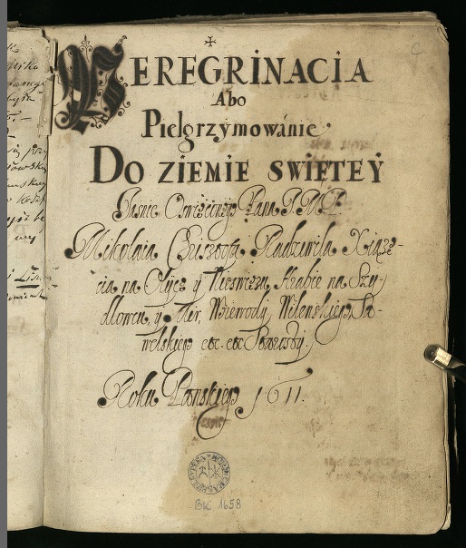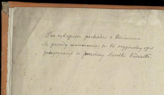 У Курніцкай бібліятэцы Польскай акадэміі навук захоўваецца рукапіс “Podróż do Ziemi Świętej, Syrii i Egiptu 1582–1584”, які датуецца канцом XVI – XVIІ ст. Цікава, што ў ім ёсць запіс на польскай мове “Гэты рукапіс паходзіць з Нясвіжа. Ёсць падставы меркаваць, што гэта арыгінальнае апісанне перэгрынацыі ў Ерусалім Радзівіла Сіроткі” (“Ten rękopism pochodzi z Nieświerza. Są powody mniemania, że to oryginylny opis peregrynacyi do Jerozolimy Sierotki Radziwiłła”).