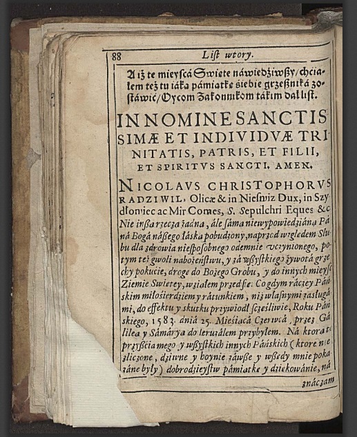 Паломніцтва з Нясвіжа ў Іерусалім у XVI ст. было вельмі сур’ёзным і складаным падарожжам. Два гады Мікалай Крыштоф Радзівіл Сіротка вандраваў і дайшоў да Труны Гасподняй. У выніку, у 90-я гг. XVI ст. ён апісаў сваё падарожжа, поўнае ўражанняў і прыгод. На жаль, арыгінальны рукапіс лічыцца зніклым. У бібліятэках розных краін захоўваюцца рукапісныя спісы.