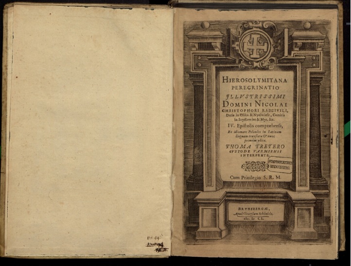 * Другое лацінамоўнае выданне “Ierosolymitana peregrinatio Nicolai Christophori Radzivili”, надрукаванае ў 1614 годзе ў выдавецтве Плантэна-Марэтуса ў Антверпене. Асобнік утрымлівае гравіраваныя тытульную старонку, пяць медзярытаў і гравіраваную выдавецкую марку Плантэна. Паходзіць з Нясвіжскай бібліятэкі Радзівілаў, пра што сведчыць чырвоная пячатка “Ordynacja Nieświeska Biblioteka”. Шыфр 096/2655К