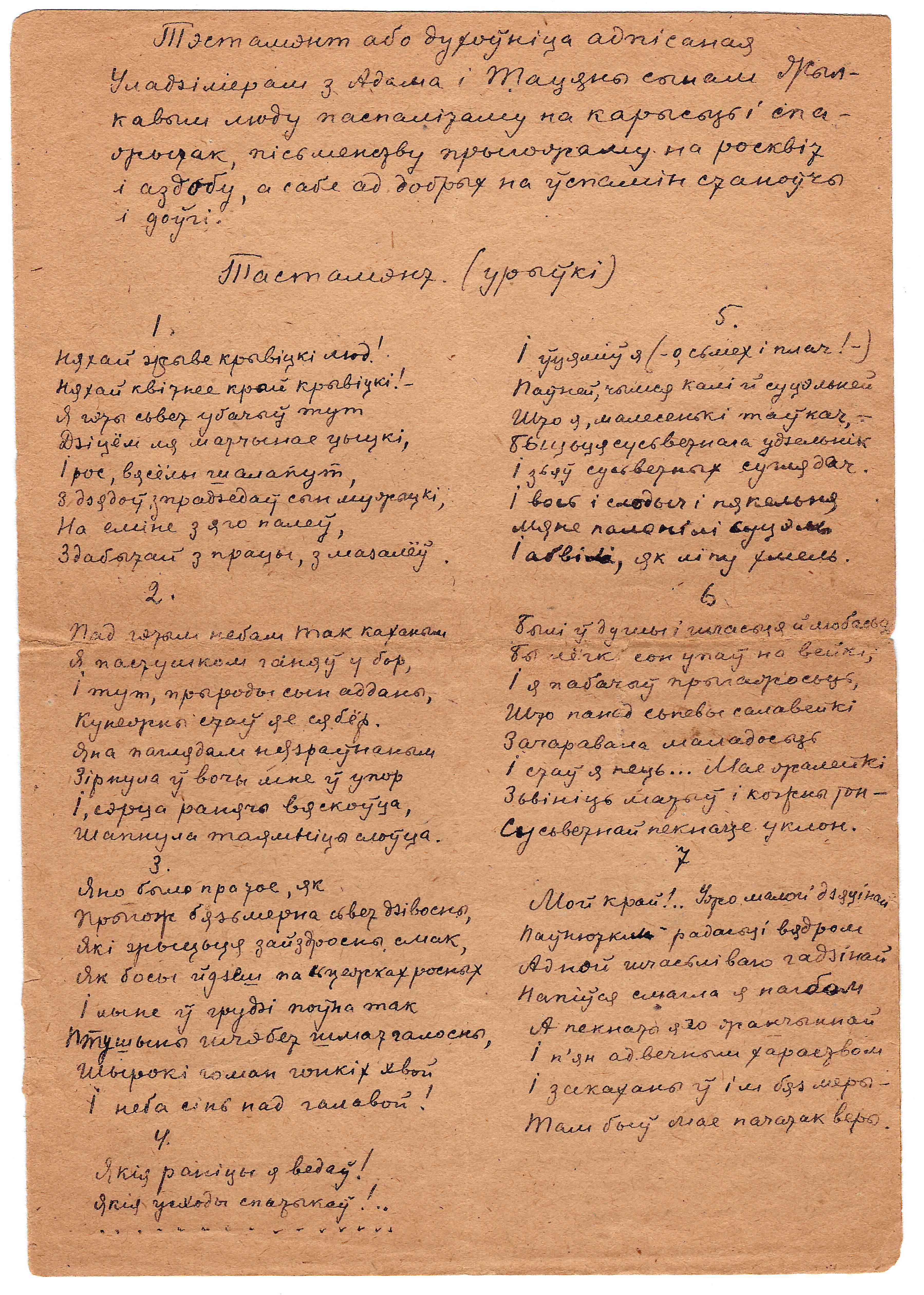 Аўтограф апошняй (перадсмяротнай) паэмы Уладзіміра Жылкі “Тэстамэнт”, напісанай у высылцы ва Уржуме.