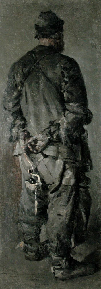 Выява шахцёра ў поўны рост, які стаіць спіной да гледача і трымае ліхтар у руках, апрануты ў старую вопратку, з шапкай на галаве.