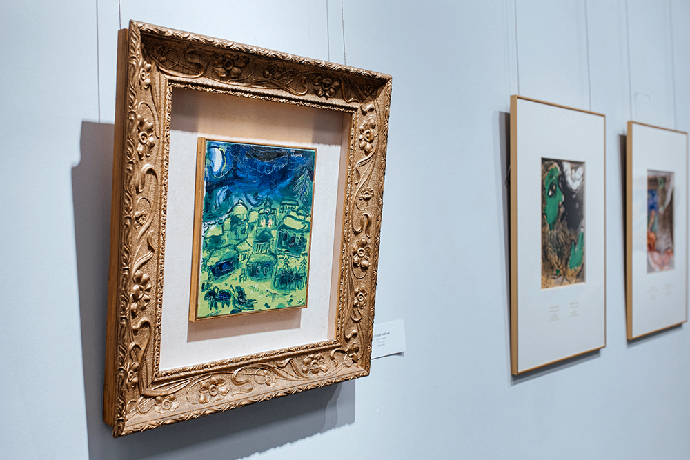 На выставе экспануюцца 28 твораў Марка Шагала, сярод якіх 4 жывапісныя і 24 графічныя работы. Дастаткова невялікая колькасць твораў ахоплівае практычна ўсе перыяды творчасці мастака. Прадстаўлены на выставе жывапіс Шагала паходзіць з калекцыі Белгазпрамбанка, якая налічвае шэсць твораў майстра розных перыядаў творчасці. Яны былі набыты ў 2011-2013 гады ў асноўным на аўкцыёнах, экспануюцца ў галерэі “Арт-Беларусь”. Чатыром карцінам нададзены статус гісторыка-культурнай каштоўнасці Рэспублікі Беларусь.