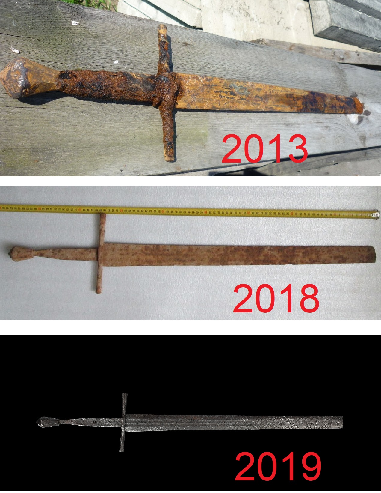 Дадзены меч быў прысвоены невысветленымі асобамі, якія ажыццяўлялі незаконныя археалагічныя пошукі (“чорныя капальнікі”) у рацэ Віхра каля г. Мсціслава ў 2013 г., і вывезены за межы Рэспублікі Беларусь. На момант знаходкі ён уваходзіў у комплекс рыцарскага ўзбраення (кіраса, шлем, фрагменты кальчугі, шпоры і інш.), які цяпер знаходзіцца ў фондах музея гісторыі г. Магілёва.
