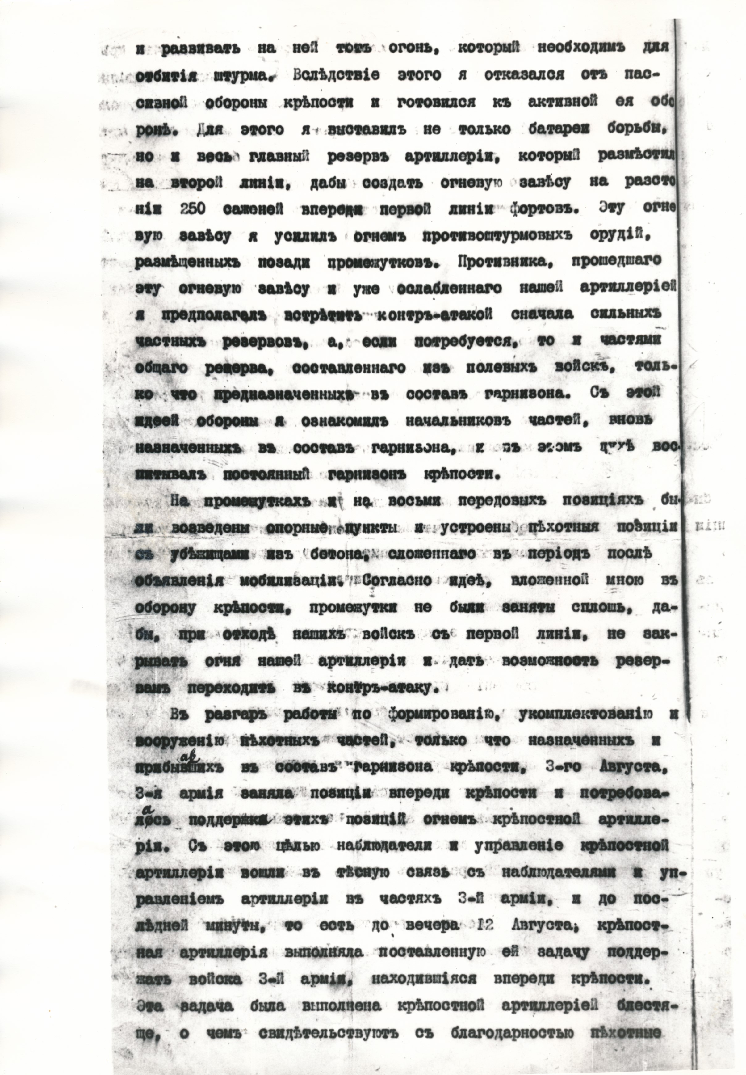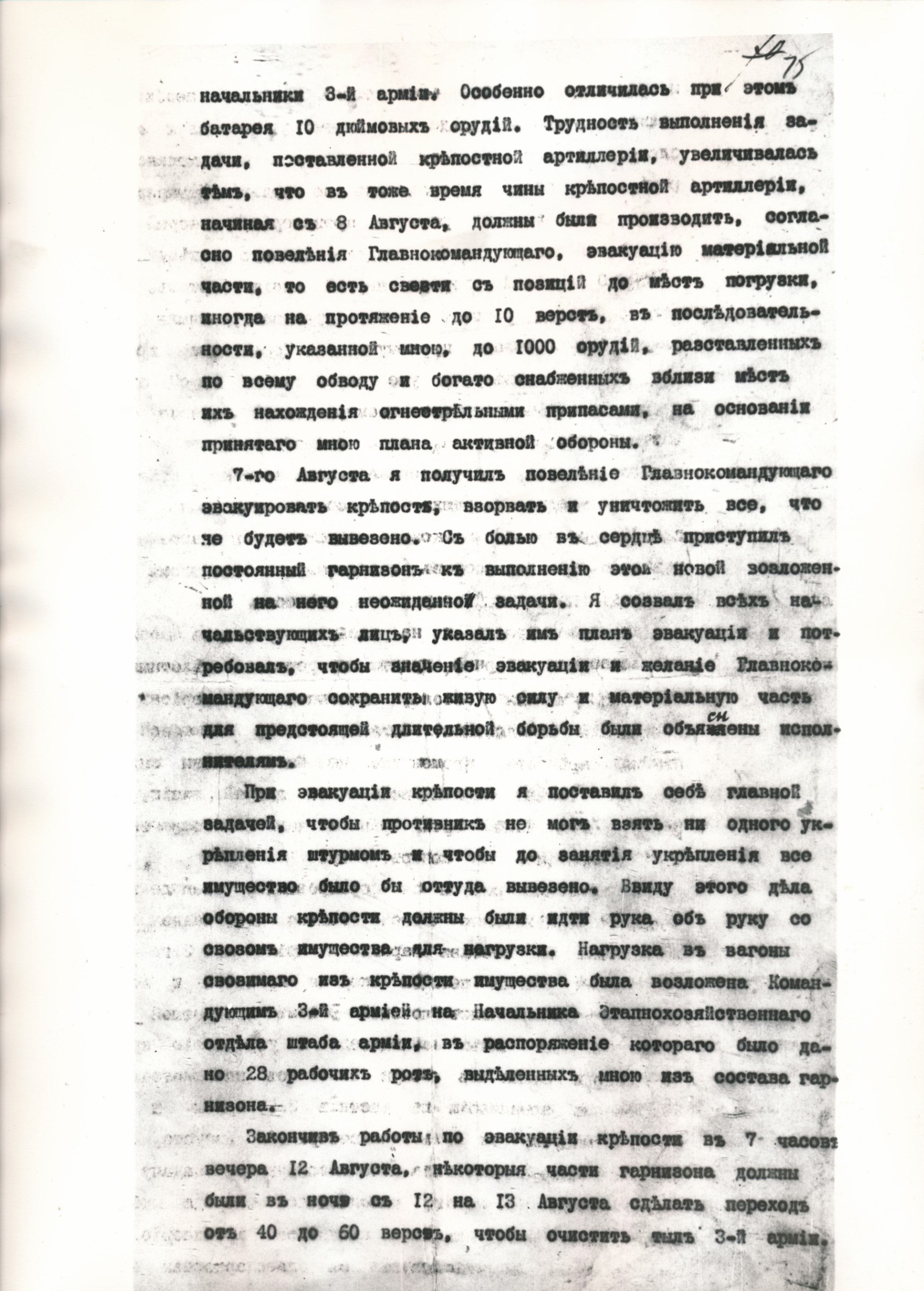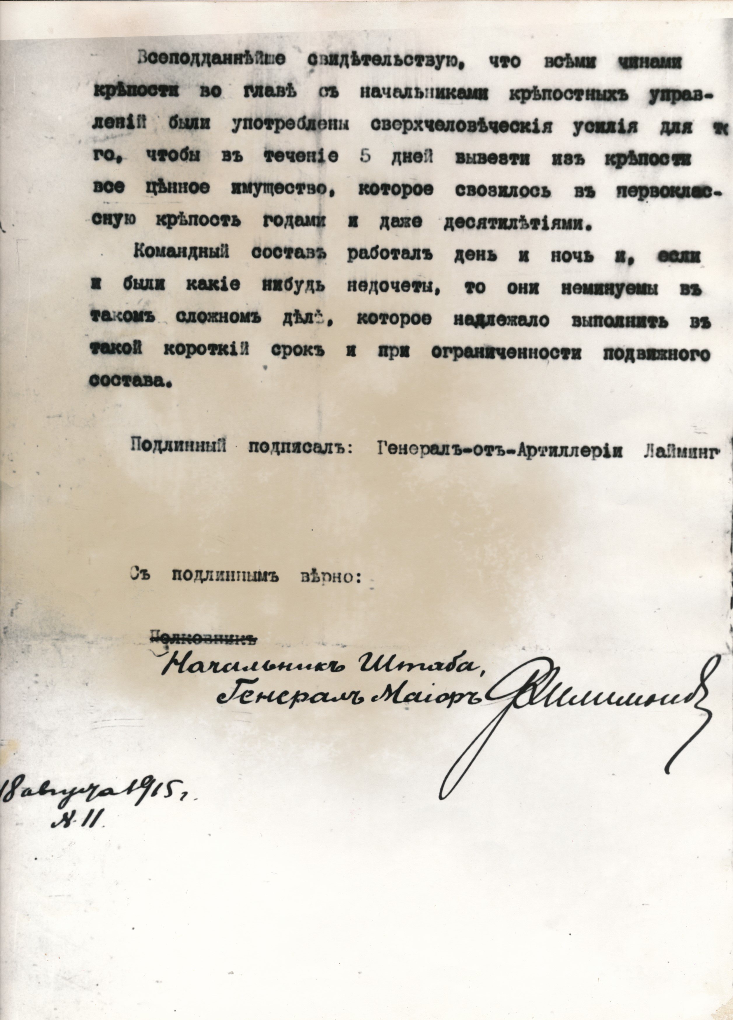 Рапарт камеданта Брэст-Літоўскай крэпасці генерала ад артылерыі У.А. Лаймінга Яго Імператарскай Вялікасці. 18.08.1915 г.