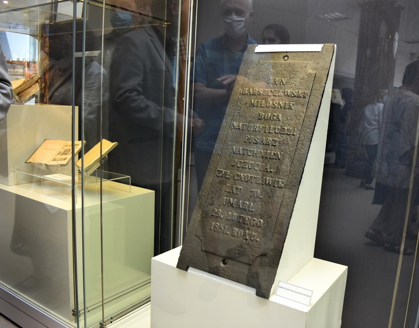 На выставе ў музеі кнігі можна пабачыць знойдзеную ў 2019 г. у г. Чуднаў Жытомірскай вобласці (Украіна) пахавальную пліту Яна Баршчэўскага, якая стала навуковай сенсацыяй і дазволіла адкрыць малавядомыя старонкі яго біяграфіі. На пліце змяшчаецца надпіс на польскай мове, які ў перакладзе на беларускую чытаецца так: «**Ян Баршчэўскі, прыхільнік Бога, прыроды і людзей, пісьменнік натхнення і пачуцця. Жыў годна 70 гадоў. Памёр 28 лютага 1851 года**».